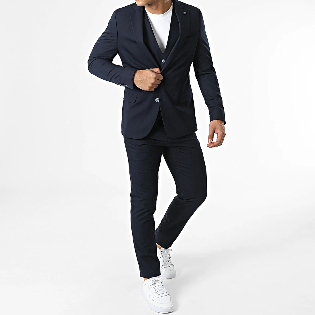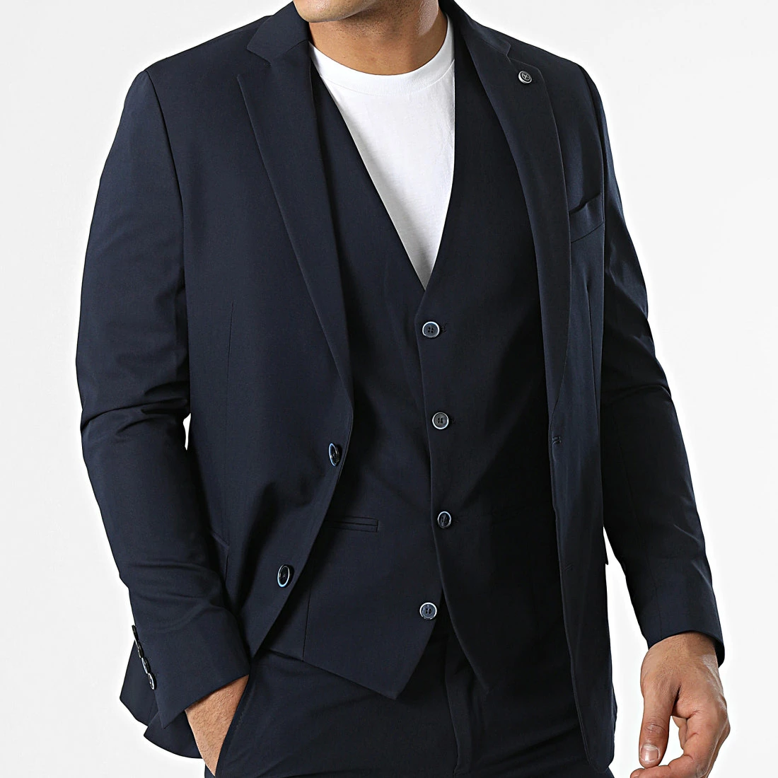 • Ensemble de costume trois pièces composé d’une veste blazer, d’un gilet et d’un pantalon droit élégant