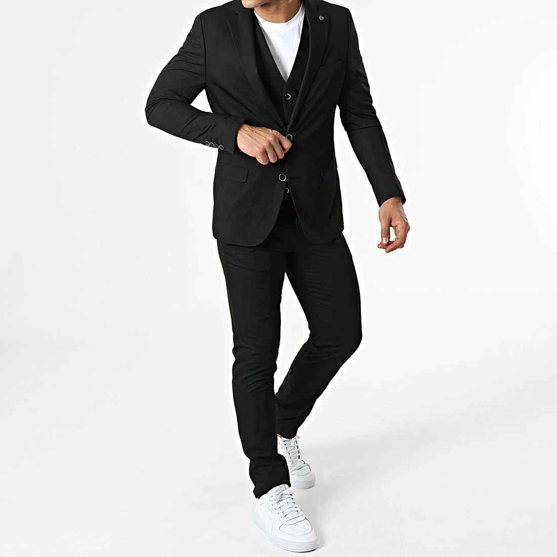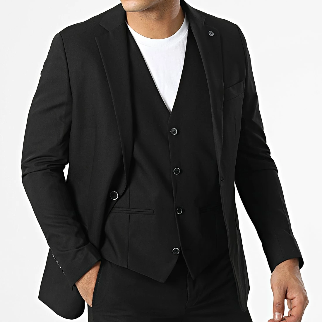 • Ensemble de costume trois pièces composĂ© d’une veste blazer, d’un gilet et d’un pantalon droit Ă©lĂ©gant